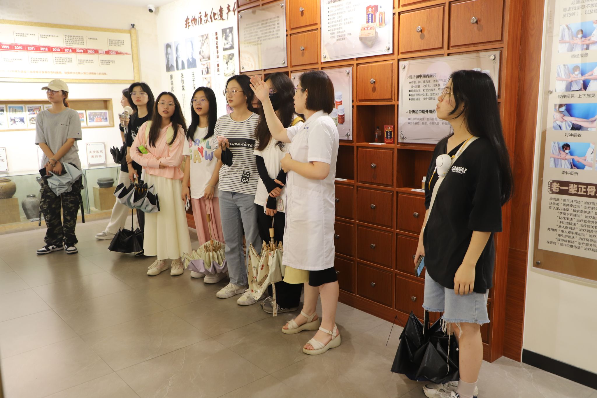 下午,同学们来到了正骨文化馆和正骨国医堂,进一步深入了解泉州正骨医院在中医药文化传承与创新方面的实践与成就。通过馆内的文字、图片、影像、铜像、老物件等多种形式,同学们系统地了解了泉州正骨与南少林文化的深厚渊源,以及中医药特色文化和技术的发展历程。通过参观学习和现场体验,同学们对正骨医院“三大法宝”——推伤、整复、自制药(院内制剂)有了更直观的认识,也对中医骨伤科传统智慧与现代科学技术结合的特色疗法产生了浓厚的兴趣。