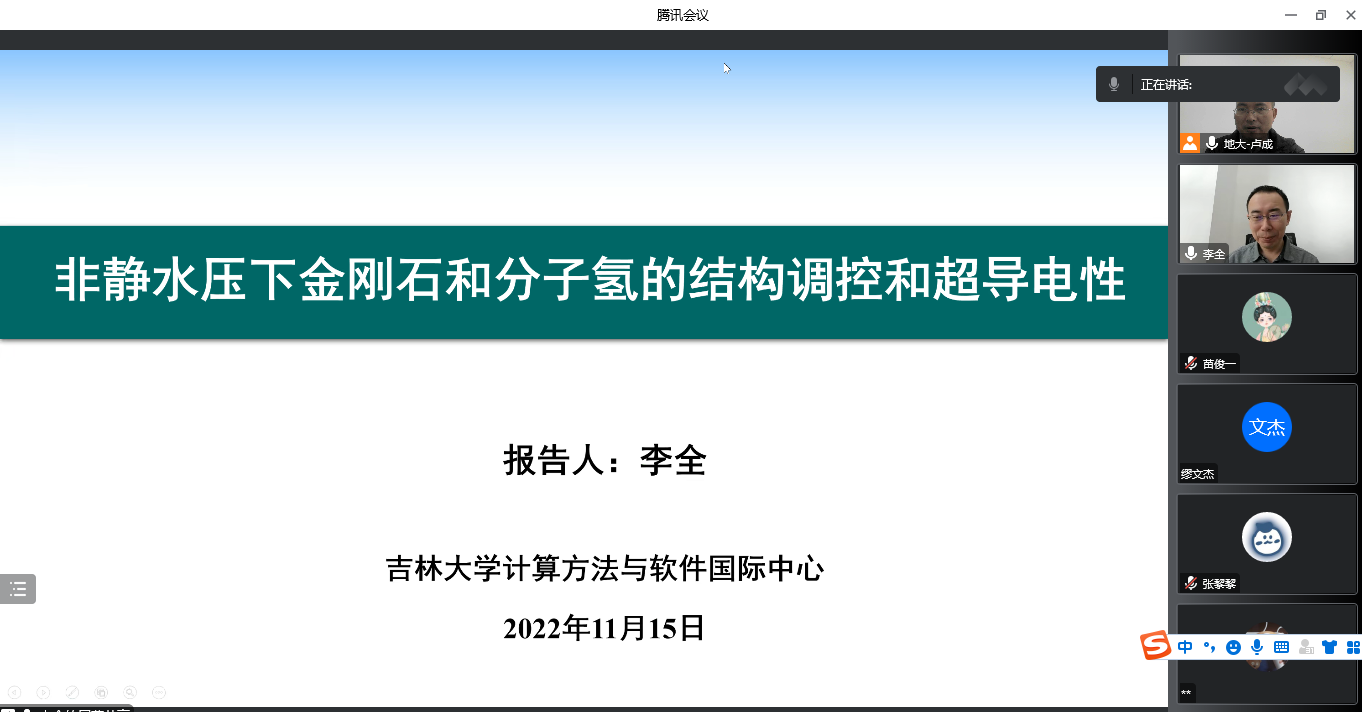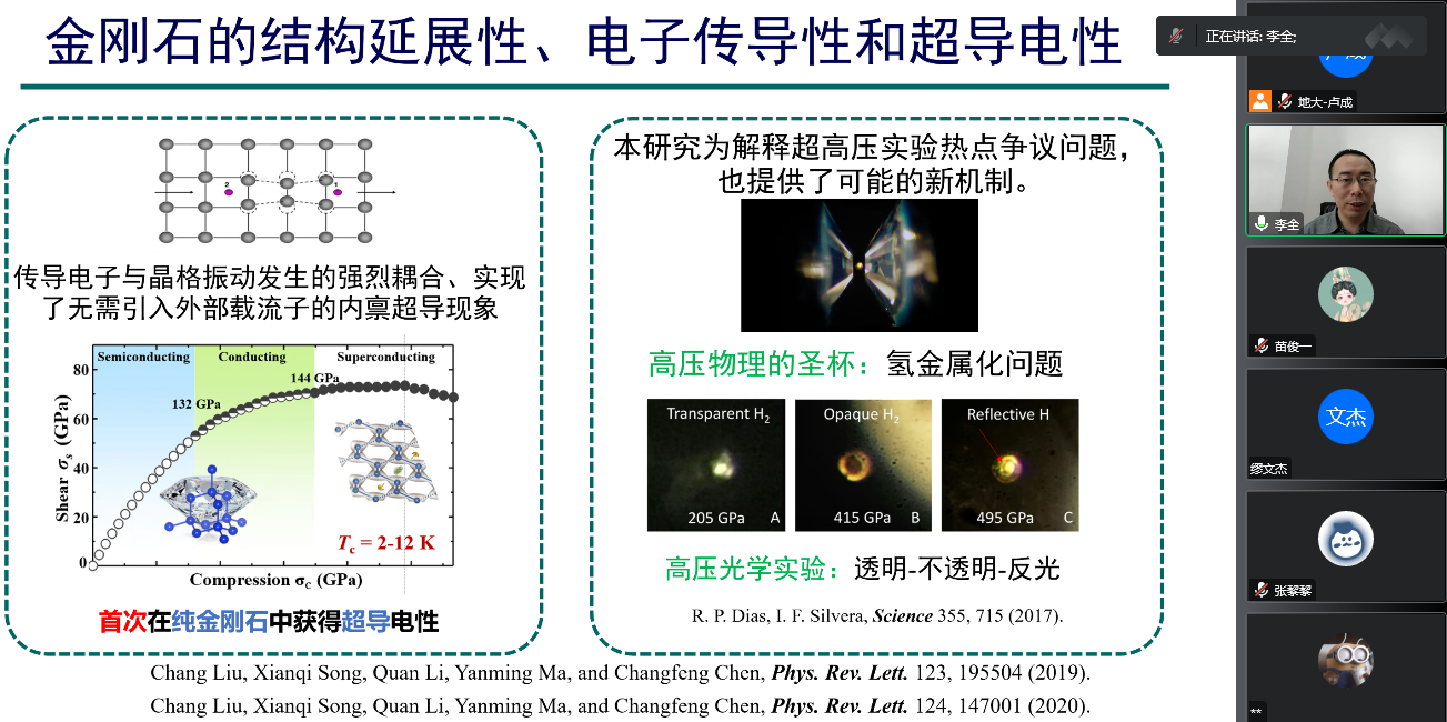 为迎接beat365官网七十周年校庆,11月15日上午,beat365平台官方网站通过线上的方式,邀请吉林大学计算方法与软件国际中心李全教授,为beat365官网物理系师生做了题为《非静水压下金刚石和分子氢的结构调控和超导电性》的学术报告。该报告由beat365官网科学技术发展院、beat365平台官方网站联合举办,卢成教授主持,本院师生共计60余人参加。