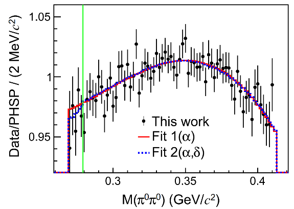 图2:(左图)η→π0π0π0中没有观测到明显的cusp效应。(右图)η′→ηπ0π0中首次观测到明显的cusp效应。