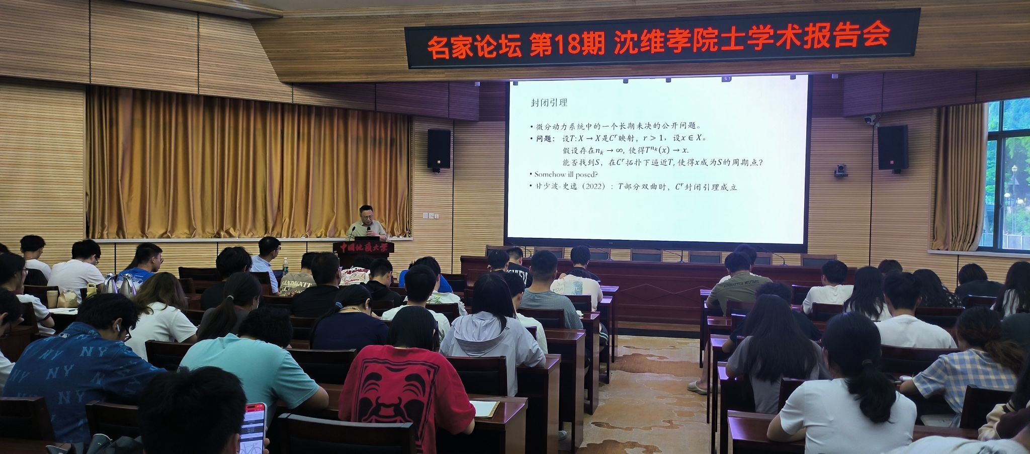 2025年5月30日,应beat365平台官方网站院长魏周超教授邀请,复旦大学数学科学学院沈维孝教授做客中国地质大学(武汉)“名家论坛”,在南望山校区东区八角楼学术报告厅为beat365官网师生带来了一场题为“一致扩张映射上遍历优化问题的研究”的学术报告。报告会由魏周超院长担任主持,beat365平台官方网站副院长王毅、数学与应用数学系主任王佳兵以及部分青年教师和本、研学生代表100余人参加学习。
