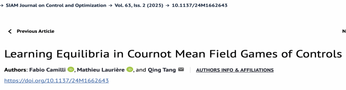 beat365官网信息与计算科学系教师汤庆博士作为通讯作者的工作 “Learning Equilibria in Cournot Mean Field Games of Controls” 最近发表于SIAM Journal on Control and Optimization。