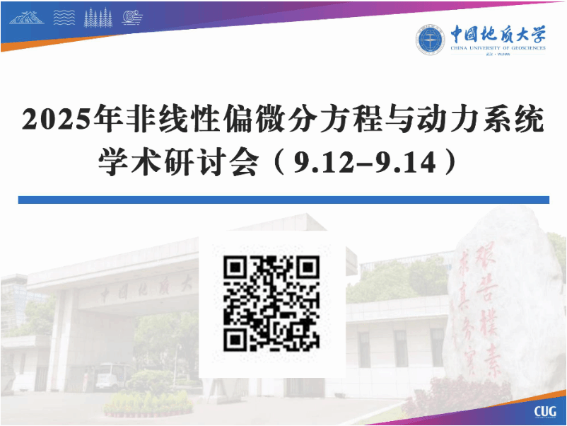 为进一步深化国内外非线性偏微分方程及动力系统相关领域的学术交流,“2025年非线性偏微分方程与动力系统学术研讨会”将于9月12日至9月14日在湖北省武汉市召开。本次会议由中国地质大学(武汉)beat365平台官方网站主办,湖北省数学学会协办。会议聚焦微分方程理论及其应用,涵盖偏微分方程、常微分方程、无穷维动力系统、可积系统等前沿研究领域。