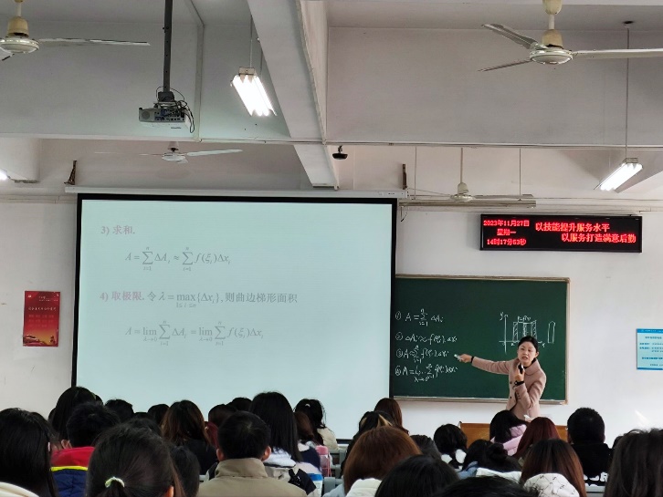2023 年 11 月 27 日,在大学数学教学部组织下,大学数学教学部多名教师在北综楼101现场观摩了陈兴荣老师的“高等数学”公开课。陈老师将多媒体与板书完美结合,授课手段使用合理有效。授课中,陈老师通过精心设计例题,丝丝入扣,教学环节衔接自然,语言准确,讲解清晰明了,将枯燥的概念讲得深入浅出,通俗易懂,启发式教学引导学生思考、分析问题,积极参与教学活动,课堂师生互动充分,整个课程气氛活跃,达到了很好的教学效果,陈老师的授课得到了观摩教师们的一致好评。