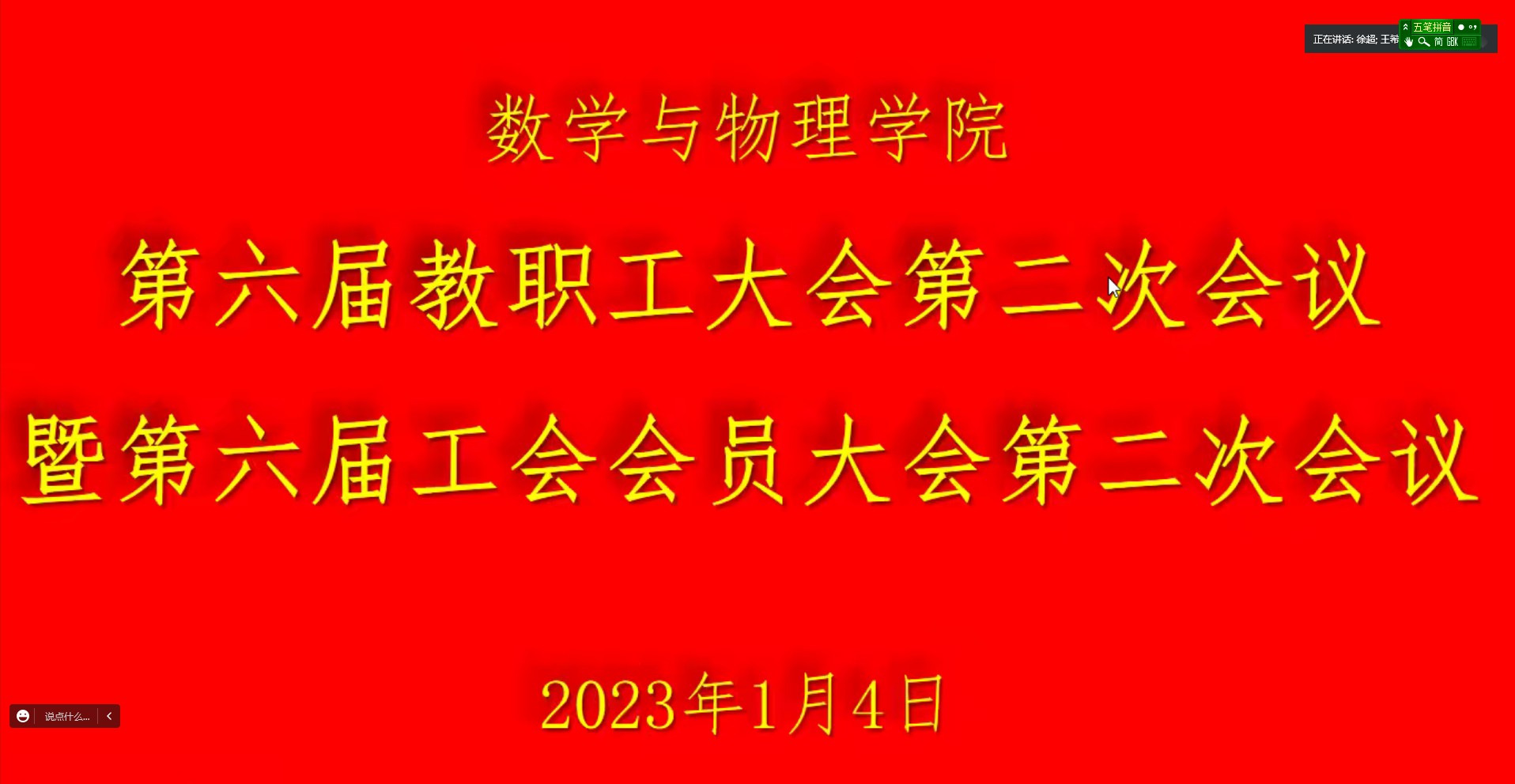 2023年1月4日上午,beat365平台官方网站第六届教职工大会暨工会会员大会第二次会议隆重召开。由于疫情原因,会议以线上腾讯会议形式召开。beat365平台官方网站党委书记吴太山、院长郭上江及学院全体教职工参加会议。院党委副书记徐超主持会议。