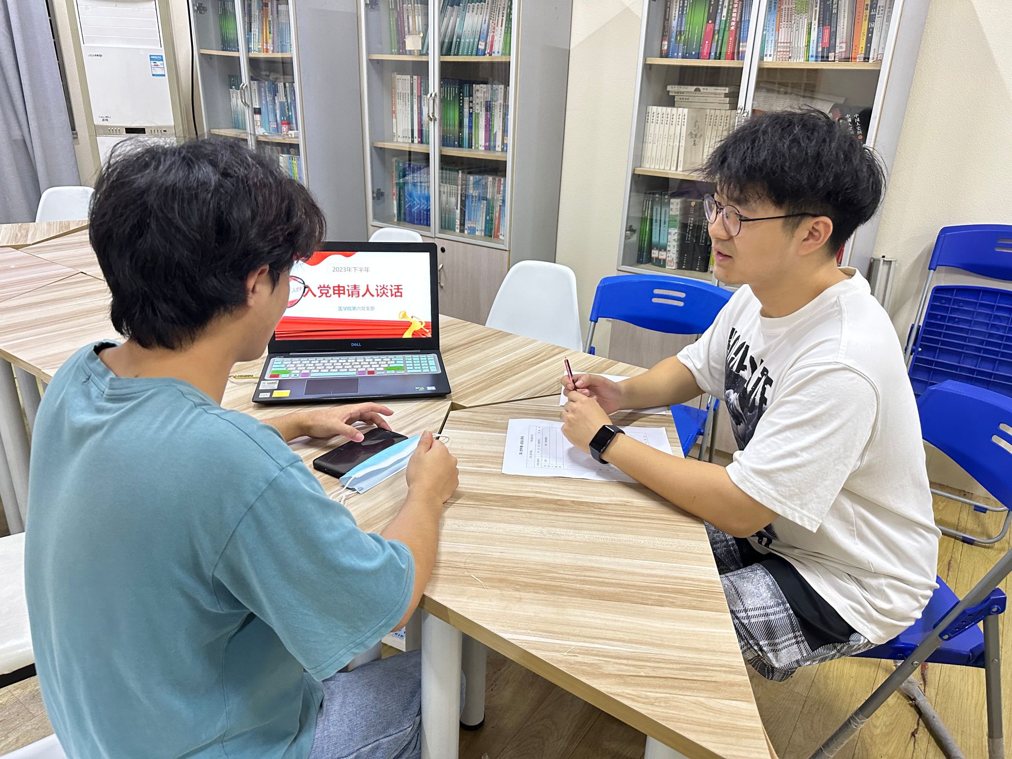 来自2022级研究生班的黄嘉伦、黄忆雯分别介绍了个人情况和入党动机,通过结构化的提问,两名入党申请人严肃认真地展开了阐述,都表现出对入党的坚定信念和向往。在谈话中,两名入党申请人都结合自身实际,探讨了一名合格党员同志的未来发展。
