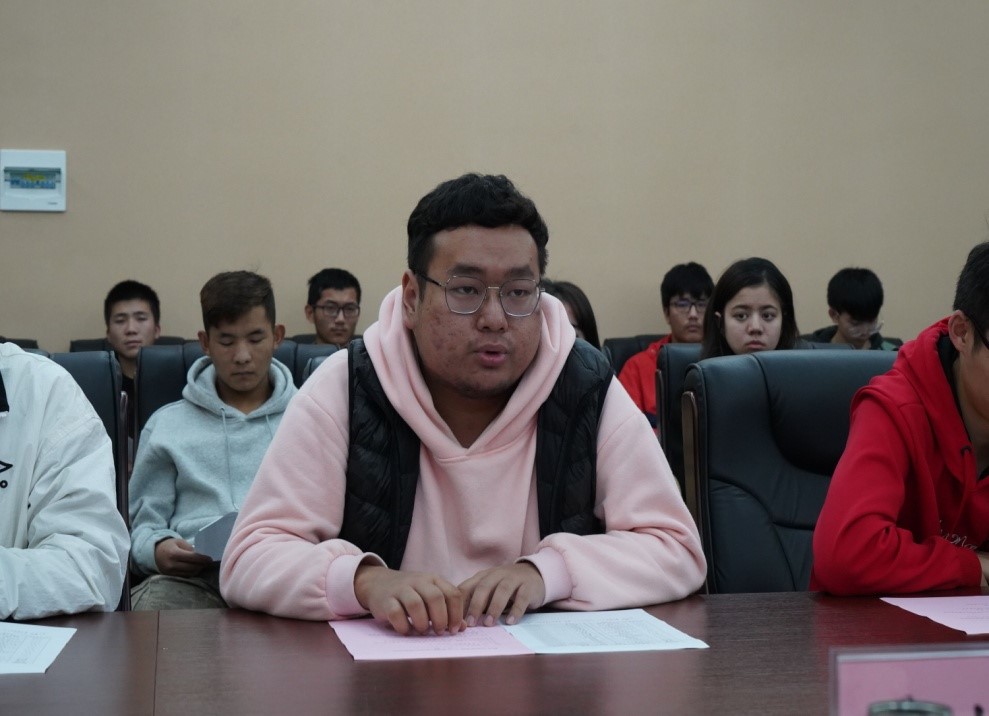 2018级预科班学生徐靖轶作为结对学生代表发言。徐靖轶同学首先讲述了自己刚入大学时学长学姐们对自己热心体贴的照顾,预科班级内同学们情同手足,以及指出学院给预科班安排的答疑辅导活动给自己以及同学们带来的极大的帮助。最后他诚挚地邀请各位老师到同学们的家乡访问考察。徐靖轶同学从自己对大学的感受出发讲出了大多数预科学生的心声,称赞了学校对预科生的一系列活动帮助之大,并且以东道主的身份热情邀请各位老师,体现出了少数民族人民的热情好客,给在场的老师们留下了很深的印象,引得一片热烈的掌声。