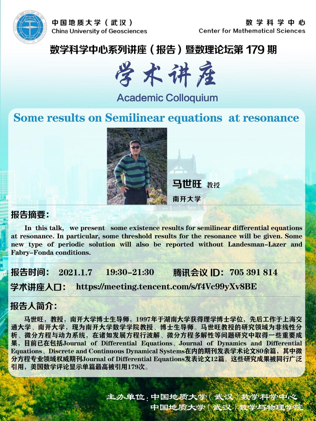 中国地质大学 数学科学中心 版权所有 地址:湖北省武汉市鲁磨路 388号 邮编:430074 鄂ICP备15021562号-1 鄂公网安备 42011102004169号